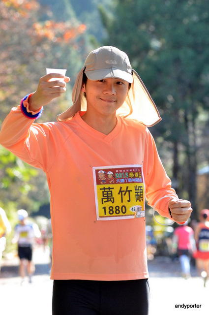 距離第三個折返點前,那段長達4K的陡上坡,讓我全程都只能步行向上,千辛萬苦取得信物後,再次"豪爽"地坐下來享受美味的蛋糕及黑咖啡。深吸幾口氣後,痛快地讓腳步順著下坡急奔至底部,當莫那魯道的雕像再次遠遠地出現,就表示離終點不遠了,倒數幾公里雖然想一口氣通過標線,但又不爭氣地被幾個小坡擊倒,最後帶著微笑,完成了這場優質的賽事。