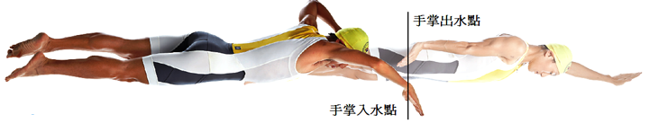 經過仔細的研究,將會發現優秀自由式選手在游自由式時,手掌入水後的位置,幾乎與它出水的位置相同,也就是說:手幾乎沒有移動,真正移動的只是身體。