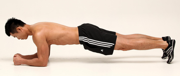 動作:身體仰躺,膝蓋彎九十度勾腳尖,把其中一隻腳的膝蓋往胸部縮,然後縮緊腹部,用臀部的力量把身體抬起,維持穩定30秒,休息30~60秒,做3~6次。關鍵是,軀幹依直保持穩定且紮實,不可過度挺腰或挺不直。